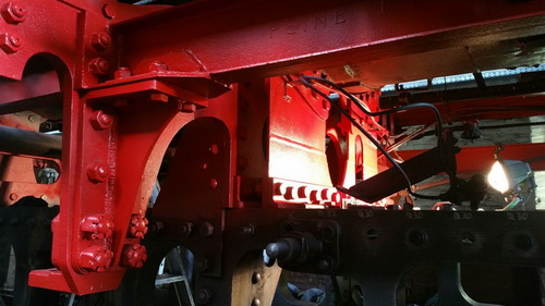 Bereits im März diesen Jahres wurde der noch in der Lok verbliebene mechanische Teil der Bremse ausgebaut. Dazu wurde in einer konzentrierten Aktion Treib. und Kuppelstangen abgebaut, die Bremsteile ausgebaut und anschließend die Stangen wieder angebaut. Ebenfalls wurden die Kolbenstangen ausgebaut.