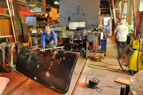Der Tender wurde mittlerweile wieder von der Lok getrennt zum Sandstrahlen zeitweise ins freie gestellt. Parallel dazu werden die bereits ausgebauten Schwallbleche neu angefertigt, so dass nach dem Sandstrahlen mit dem Einbau der neuen Bleche fortgefahren werden kann: