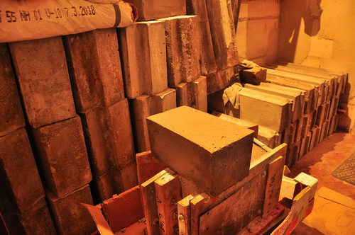 In Heimarbeit geht es sukzessive weiter mit dem Guss von Feuerschirm- und Ausmauerungssteinen, der sich langsam dem Ende nähert. Die Keller füllen sich zunehmend und die tonnenweise hergestellten Steine sollen sehr bald gebrannt werden, um sie dann einbauen zu können: