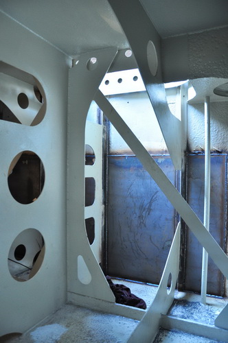 Der Tender ist im Inneren bereits komplett sandgestrahlt und mit einer Rostschutzfarbe versehen. Aktuell werden vereinzelt neue Schwallbleche angefertigt und anschließend im Tender wieder eingebracht.