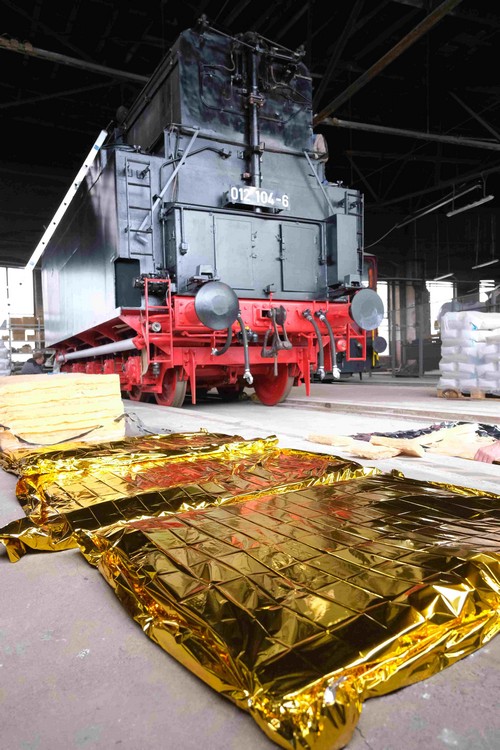 Trotz teils eisiger Temperaturen wurde auch im Januar weiter an 01 1104 gearbeitet. Die Verkleidungsbleche des Langkessels wurden zum Einbau vorbereitet, der Langkessel wurde mit Isolierung versehen und die Bleche bereits wieder teilweise montiert: