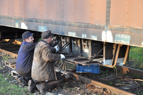 Unser Übernachtungswagen steht mittlerweile wieder auf eigenen Achsen. Dazu wurden die sandgestrahlten Drehgestelle erst grundiert, lackiert und dann wieder zusammengebaut und wieder an ihren angestammten Platz unter dem Wagen verbracht, parallel wurde der Wagen mit einer durchgehenden Haupfluftbehälterleitung versehen: